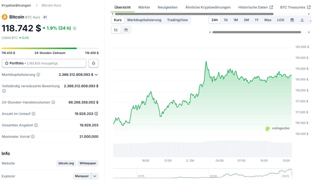 In den USA sorgt der erste Regierungsshutdown seit sieben Jahren für Verunsicherung. Normalerweise reagieren Märkte nervös und flüchten in sichere Anlagen wie Gold. Doch diesmal fällt Bitcoin besonders auf. Die Kryptowährung steigt über 119.000 Dollar und zeigt beeindruckende Stärke.