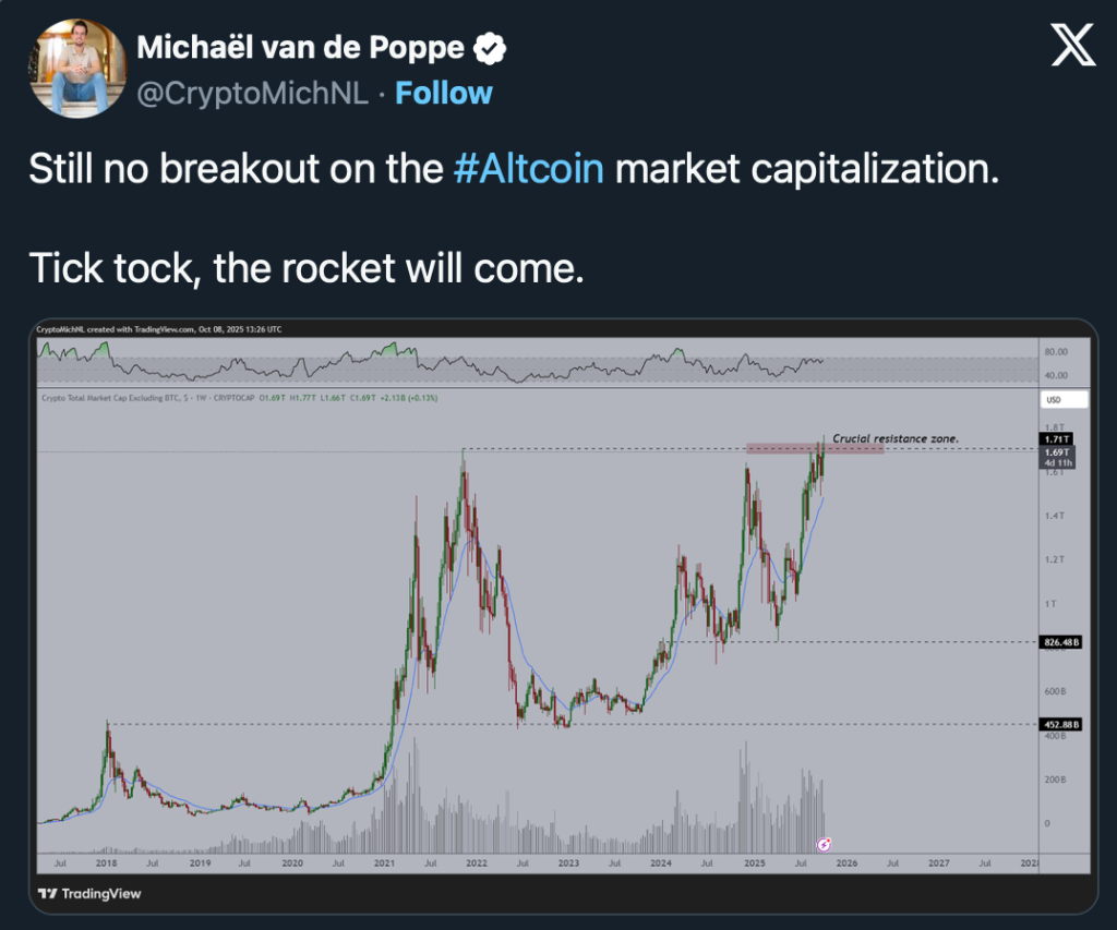 Analyst Michaël van de Poppe blickt optimistisch auf den Altcoin-Markt. Ihm zufolge steht die Altcoin-Gesamtmarktkapitalisierung kurz vor einem entscheidenden Ausbruch über die Marke von 2 Billionen Dollar. Der Kryptomarkt könnte sich aktuell kurz vor einer der explosivsten Phasen des laufenden Zyklus befinden, da Bitcoin zwar bereits mehrere neue Allzeithöchststände erreicht hat, doch im Altcoin-Sektor gibt es weiterhin starke Defizite.