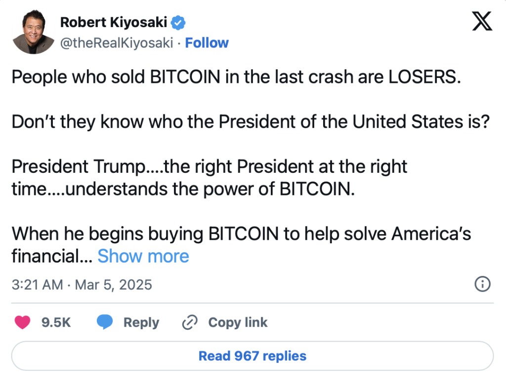 In einem Post auf X vom 6. März 2025 bezeichnet Robert Kiyosaki Menschen, die Bitcoin während des letzten Kurssturzes verkauft haben, als “Verlierer”. Er führt an, dass emotionsgetriebene Entscheidungen viele Händler aus dem Markt gedrängt haben. Dabei verweist er besonders auf die Bedeutung der politischen Situation unter US-Präsident Donald Trump, den er als “richtigen Präsidenten zur richtigen Zeit” beschreibt, der die Bedeutung von Bitcoin verstehe.
