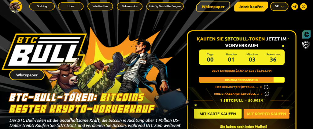 Der Bitcoin Bull Token positioniert sich als Community-Coin mit attraktiven Anreizen für frühe Investoren. Im Zentrum des Projekts stehen Airdrops, Burn-Events und ein Staking-Programm, das aktuell eine Rendite von etwa 126 Prozent bietet. Der Token ist derzeit für 0,0024 US-Dollar erhältlich, wobei der Preis in regelmäßigen Abständen bis zum offiziellen Börsengang steigen wird.