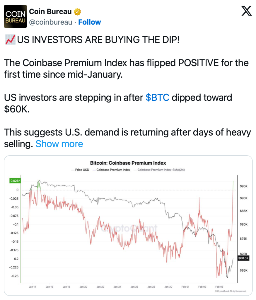 Ein häufig genutzter Gradmesser für US-Nachfrage ist der sogenannte Coinbase Premium Index. Vereinfacht misst er den Preisabstand von Bitcoin auf Coinbase (USD-Markt, stark US-geprägt) gegenüber großen globalen Börsen wie Binance (oft USDT-dominiert). Dreht der Spread ins Positive, wird Bitcoin auf Coinbase relativ teurer gehandelt – das wird typischerweise als Zeichen interpretiert, dass auf der US-Seite mehr Kaufdruck ankommt als im Offshore-Handel. Genau das meldeten in den letzten 24 bis 48 Stunden mehrere Marktbeobachter: Der Coinbase-Premium sei erstmals seit Mitte Januar wieder positiv geworden.