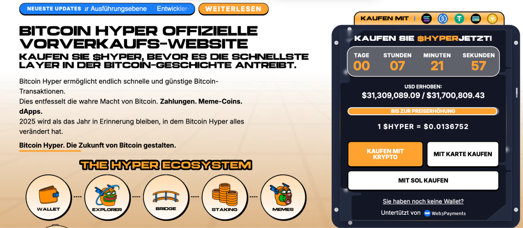 Wenn Vertrauen in das Basisnetzwerk zurückkehrt, steigt häufig auch das Interesse an Lösungen, die Skalierung, Geschwindigkeit oder zusätzliche Anwendungen rund um Bitcoin ermöglichen. In diesem Kontext wird aktuell verstärkt über Bitcoin Hyper gesprochen. Das Projekt positioniert sich als Layer-2-Lösung, die Bitcoin-Transaktionen mit höherer Geschwindigkeit und erweiterten Smart-Contract-Funktionen verbinden soll. Technologisch setzt Bitcoin Hyper dabei auf eine Bridge-Architektur, die Bitcoin mit einer Solana-Virtual-Machine-Umgebung verknüpft. Das Ziel ist es, die Sicherheit des Bitcoin-Netzwerks mit der hohen Transaktionsgeschwindigkeit und Programmierbarkeit moderner Smart-Contract-Plattformen zu kombinieren.