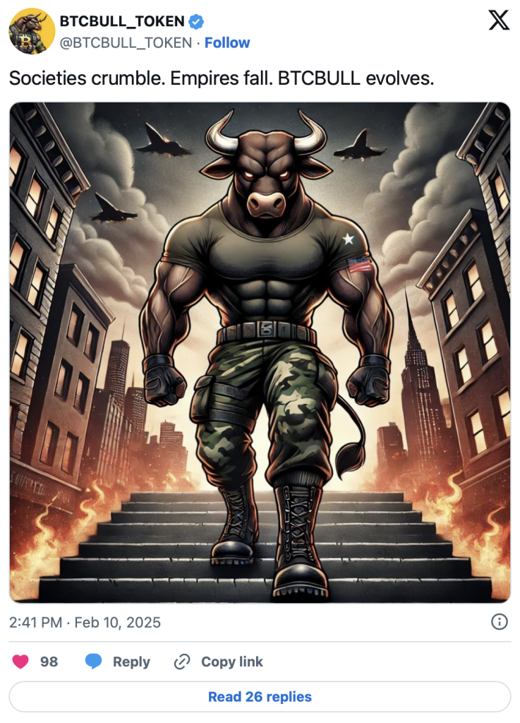Das Bitcoin Bull Projekt ist ein Memecoin, der es Anlegern ermöglicht, Bitcoin auf seiner weiteren Kursentwicklung (bis auf womöglich 250.000 US-Dollar) zu begleiten. Dabei winken entlang des Weges attraktive Rewards in Form von Airdrops echter Bitcoins oder Token-Burns. Beide Maßnahmen treten jeweils in Kraft, wenn Bitcoin bestimmte Kursmeilensteine erreicht. Der Coin erfreut sich bereits großer Beliebtheit – aktuell wurden im Presale bereits 4,4 Millionen US-Dollar eingesammelt, womit die nächste Preiserhöhung kurz bevorsteht.