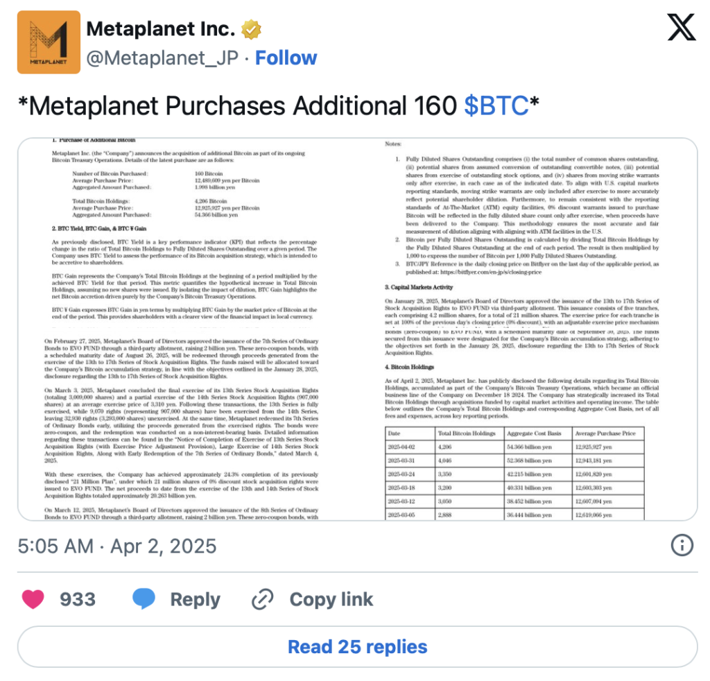 Ebenfalls am Plan, Bitcoin zu kaufen, hält die japanische Holding Metaplanet fest. Das Unternehmen aus Japan hat kürzlich 696 Bitcoins im Wert von 58 Millionen US-Dollar gekauft und hält damit erstmals mehr als 4.000 Coins. Zudem gab das Management bekannt, Wandelanleihen im Wert von 13,3 Millionen US-Dollar zu 0 Prozent Zinsen ausgegeben zu haben, um die Käufe in Zukunft fortzusetzen.