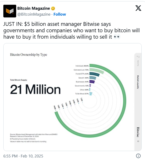 Der Vermögensverwalter Bitwise, der ein Vermögen von 5 Milliarden Dollar verwaltet, warnt vor einer möglichen Knappheit im Bitcoin-Angebot. Die steigende Nachfrage von institutionellen Investoren, Unternehmen und Regierungen könnte das auf 21 Millionen Coins begrenzte Angebot schon bald übersteigen.