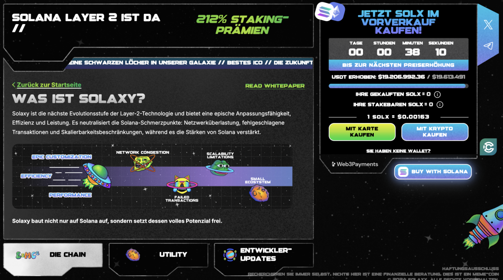 Der SOLX-Token ist aktuell im Presale zu einem Preis von 0,00163 Dollar erhältlich und konnte bereits über 19 Millionen Dollar an Investitionen einsammeln. Zusätzlich bietet das Projekt eine Staking-Option mit einer jährlichen Rendite von bis zu 200%.