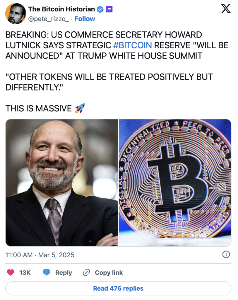 Besonders interessant ist dabei die Aussage des Handelsministers, dass Bitcoin und Altcoins möglicherweise unterschiedlich behandelt werden. “Bitcoin ist also eine Sache, und die anderen Währungen, die anderen Krypto-Token, werden glaube ich anders behandelt werden – positiv, aber anders”, erklärte er. Trump hatte zuvor neben Bitcoin und Ethereum auch XRP, Solana und Cardano als potenzielle Bestandteile der Reserve genannt.