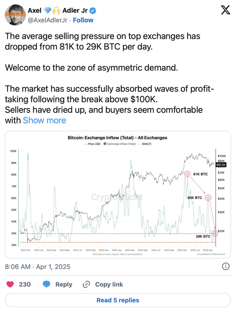 Der bekannte Krypto-Analyst Axel Adler Jr. beschreibt in seiner aktuellen Einschätzung mehrere zentrale Veränderungen im Bitcoin-Markt – sowohl auf der Spot- als auch auf der Derivatseite. Ein besonderer Fokus liegt auf dem rückläufigen Verkaufsdruck. Während auf den großen Börsen zuletzt täglich rund 81.000 BTC zum Verkauf standen, ist dieses Volumen mittlerweile auf etwa 29.000 BTC gefallen. Diese Entwicklung deutet auf eine Phase abnehmender Gewinnmitnahmen hin, was typischerweise nach starken Kursanstiegen wie dem Überschreiten der 100.000-Dollar-Marke einsetzt.