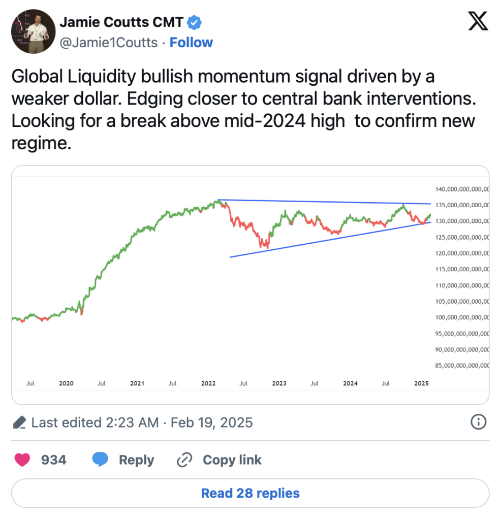 Der bekannte Makro-Experte Jamie Coutts sieht in der aktuellen Entwicklung ein bullisches Momentum, das durch einen schwächeren US-Dollar zusätzlich verstärkt wird. Eine nachlassende Dollar-Stärke führt typischerweise zu erhöhter Kapitalverfügbarkeit und stärkt risikoreiche Anlagen wie Bitcoin.