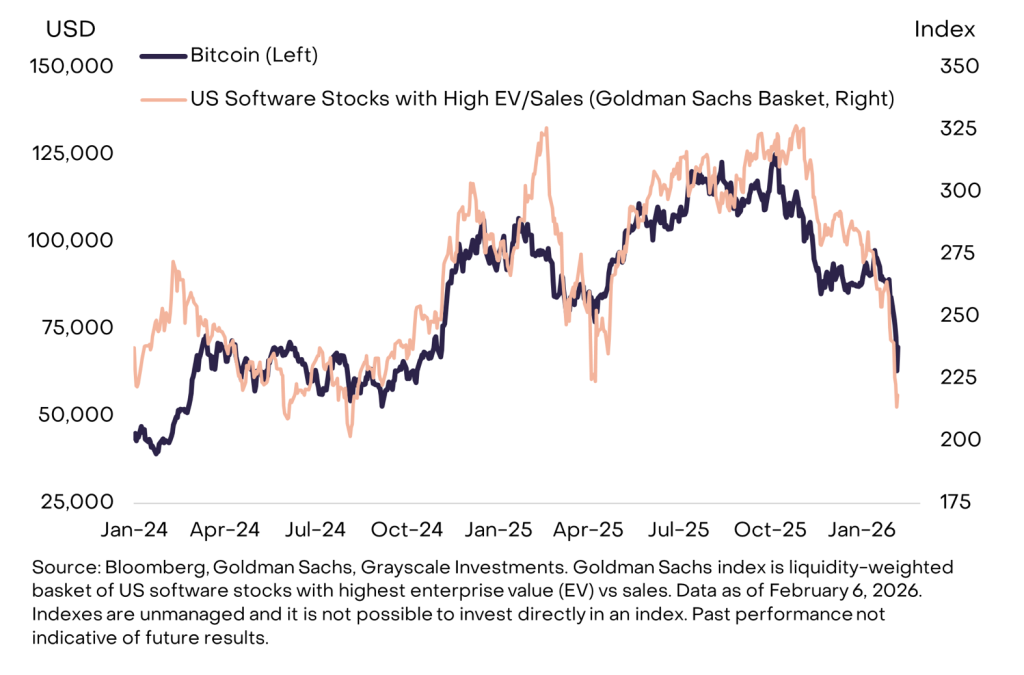 Als konkretes Marktbild nennt Grayscale den Rücksetzer auf rund 60.000 US-Dollar am 5. Februar, gefolgt von einer teilweisen Erholung in den Tagen danach. Der Abverkauf sei zeitlich mit der Schwäche in „High-Growth“-Softwarewerten und frühen Tech-Segmenten zusammengefallen – ein Muster, das eher zu „Derisking“ in Growth-Portfolios passt als zu einem idiosynkratischen Krypto-Schock.