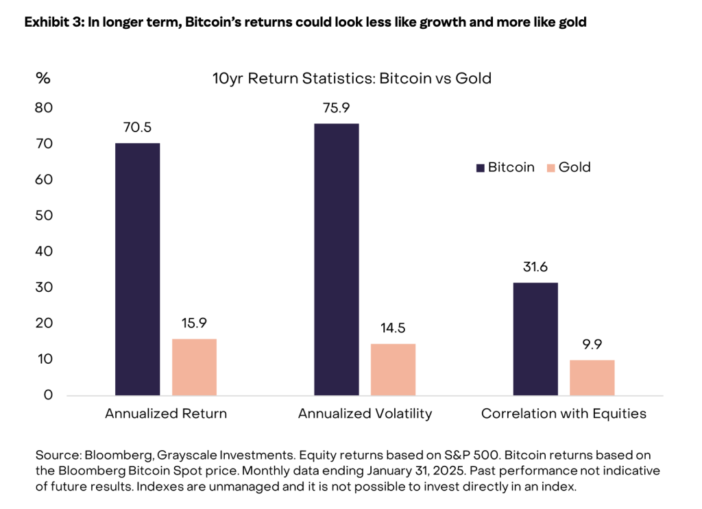 Die Kernaussage der Studie lautet deshalb nicht „Bitcoin ist kein Wertspeicher“, sondern: Die Investment-These sei heute vor allem eine Wette auf Adoption – also darauf, dass sich Bitcoin als monetäres, digitales Gut weiter durchsetzt. Solange dieser Reifeprozess andauert, können Kurs und Volatilität eher den Charakter eines Growth-Assets tragen, inklusive höherer Aktienkorrelation. Grayscale formuliert das bewusst als „beides“: In der langen Frist könne Bitcoin, falls es den Status eines etablierten monetären Assets erreicht, tendenziell „gold-ähnlicher“ werden – mit geringerer Volatilität, geringerer Aktienkorrelation und entsprechend niedrigeren erwarteten Renditen, wie sie bei reifen Wertspeichern typischer sind.
