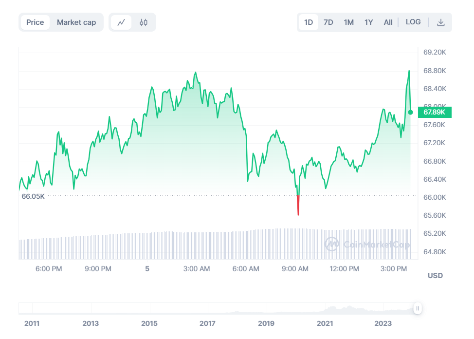 Der Bitcoin-Preis stieg in den letzten 24 Stunden um fast 4 % und erreichte in der vergangenen Woche einen Anstieg von 20 %. Diese Kryptowährung zielt darauf ab, ihren historischen Höchststand von 68.999,99 US-Dollar wieder zu erreichen, ein Niveau, das zuletzt im November 2021 beobachtet wurde. Derzeit wird sie zu ungefähr 68.979,72 US-Dollar gehandelt, was sie ihrem Allzeithoch (ATH) sehr nahe bringt.