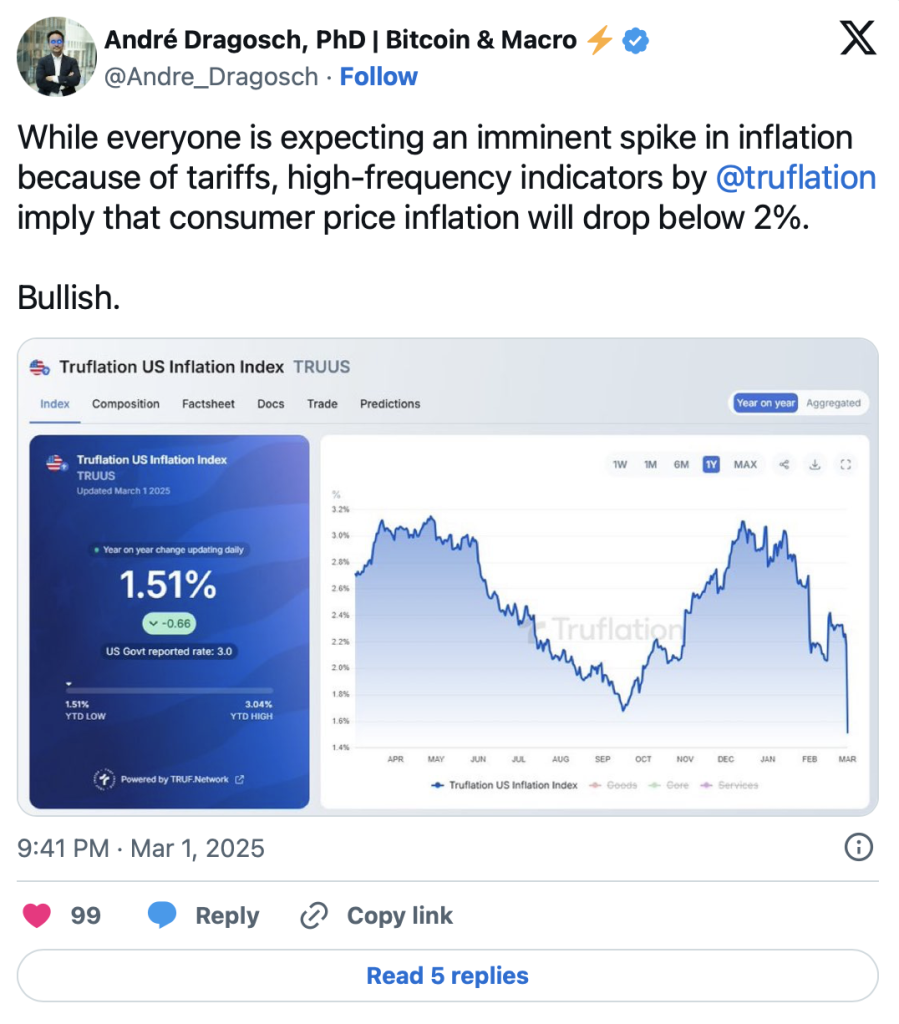 Entgegen der weit verbreiteten Befürchtung eines Inflationsanstiegs durch neue Zölle zeigen sich alternative Indikatoren optimistischer. Der Makro-Analyst André Dragosch verweist auf Hochfrequenzindikatoren von Truflation, die darauf hindeuten, dass die Verbraucherpreisinflation bald unter 2 Prozent fallen könnte.
