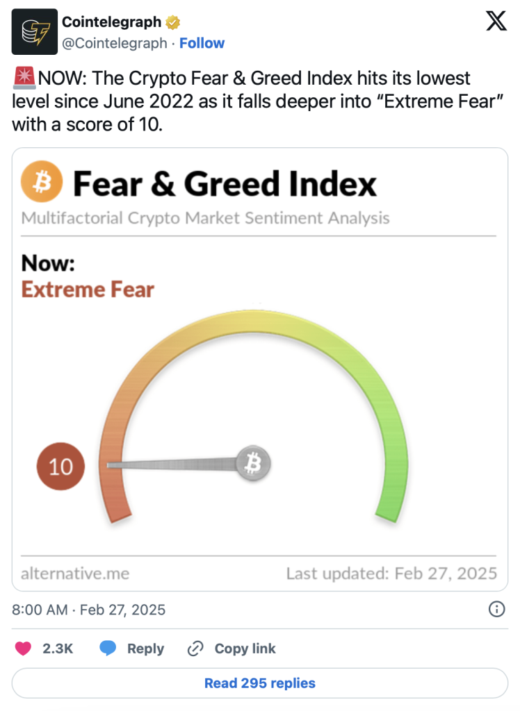 Der Fear and Greed Index ist für Krypto-Investoren ein wichtiger Stimmungsindikator. Als Kontraindikator zeigt er an, wann der Markt möglicherweise überverkauft oder überkauft ist. Aktuell liegt der Index bei nur 10 Punkten und damit im Bereich “Extreme Fear” – so tief wie seit Juni 2022 nicht mehr.