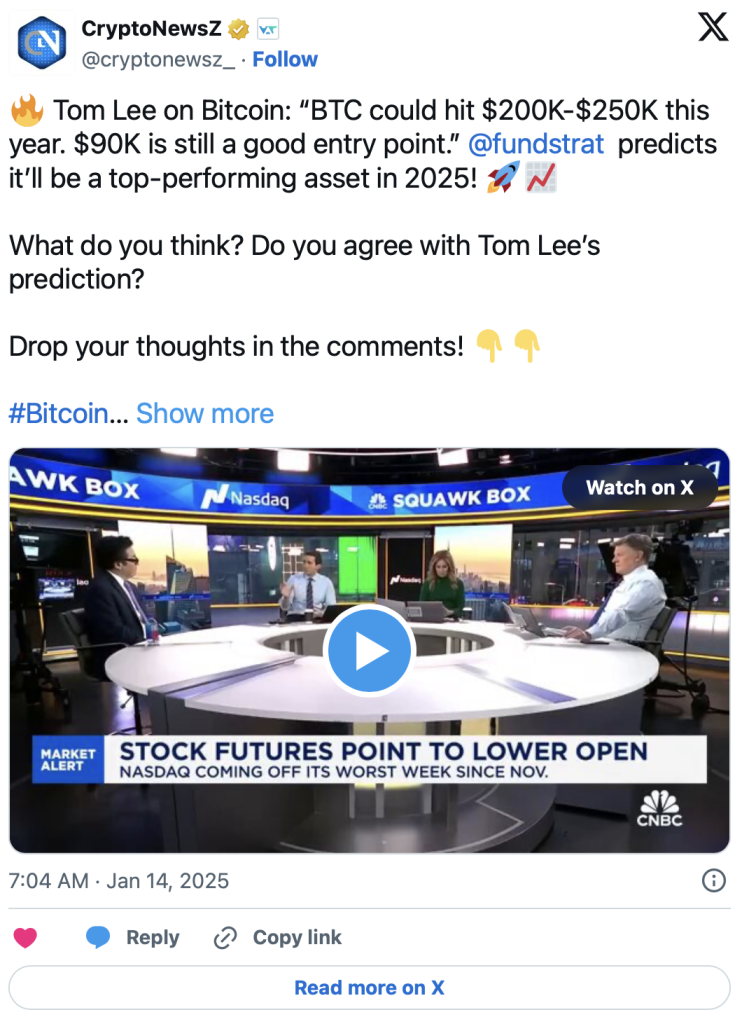 Tom Lee, Chefstratege von Fundstrat, prognostiziert für Bitcoin in diesem Jahr ein Kursziel von 250.000 US-Dollar. Seine Prognose stützt er auf drei zentrale Faktoren: Steigende Zuflüsse durch die neu zugelassenen Bitcoin-ETFs in den USA, ein geringeres Angebot durch das bevorstehende Halving sowie sinkende Zinsen, die generell positiv für spekulative Assets sind.