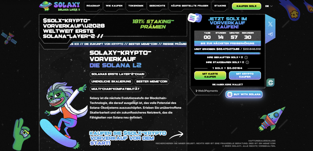 Das Projekt Solaxy präsentiert sich mit seinem SOLX Token als innovative Investitionsalternative zu Bitcoin. Als erste Layer-2-Lösung für das Solana-Ökosystem hat das Projekt bereits über 22,5 Millionen Dollar im Presale eingesammelt.