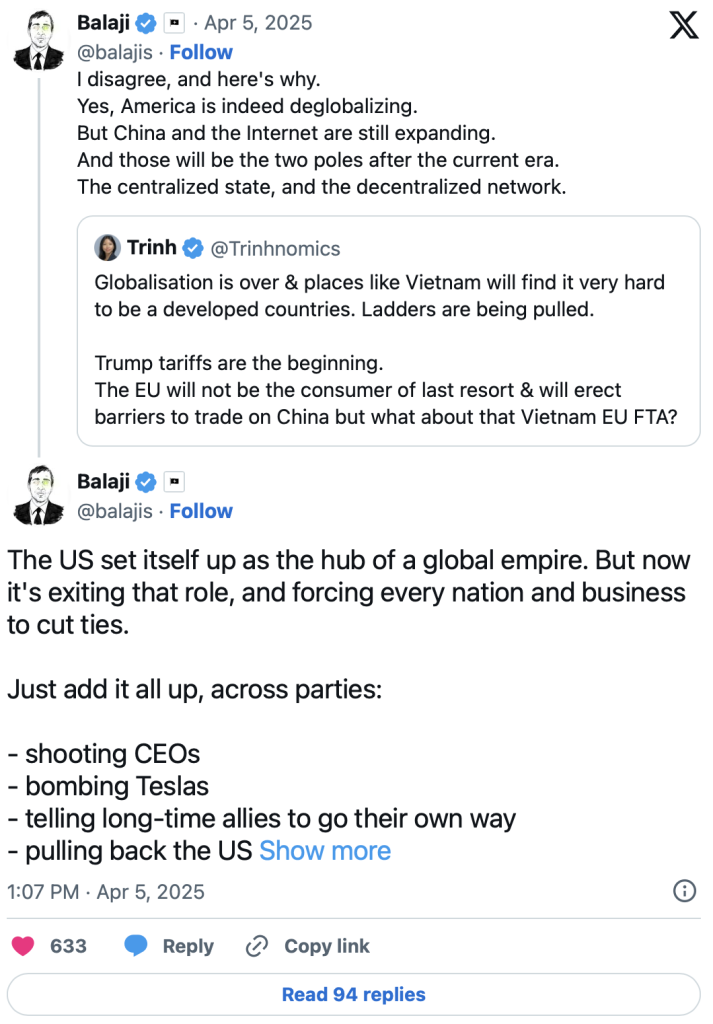 Der bekannte Tech-Investor Balaji argumentiert gegen die These vom Ende der Globalisierung. Er sieht vielmehr eine Transformation mit zwei expandierenden Polen: China als zentralisierter Staat und das Internet als dezentrales Netzwerk. Amerika ziehe sich aus seiner Rolle als globales Imperium zurück und zwinge andere Nationen und Unternehmen, ihre Verbindungen zu kappen.