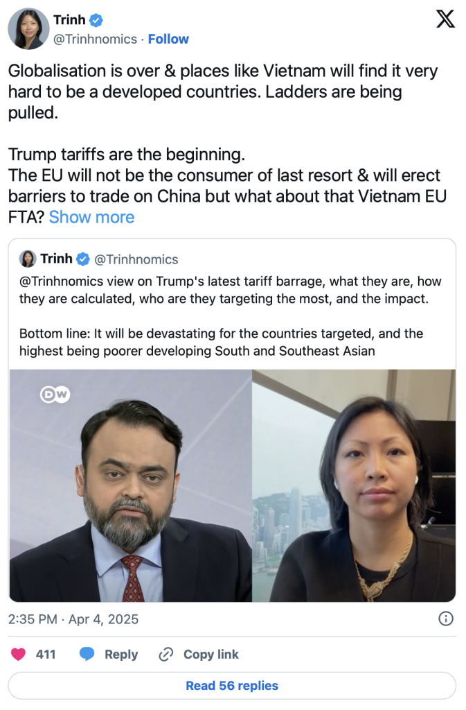 Laut der X-Nutzerin Tinkh haben Entwicklungsländer wie Vietnam inzwischen nur noch geringe Chancen, zu Industriestaaten aufzusteigen. Der traditionelle Entwicklungspfad über günstige Exporte werde zunehmend vom Westen blockiert. Als entscheidenden Wendepunkt dieser Entwicklung betrachtet sie die neuen Zölle der Trump-Regierung, die eine Kettenreaktion von Handelsbarrieren in anderen Ländern auslösen.