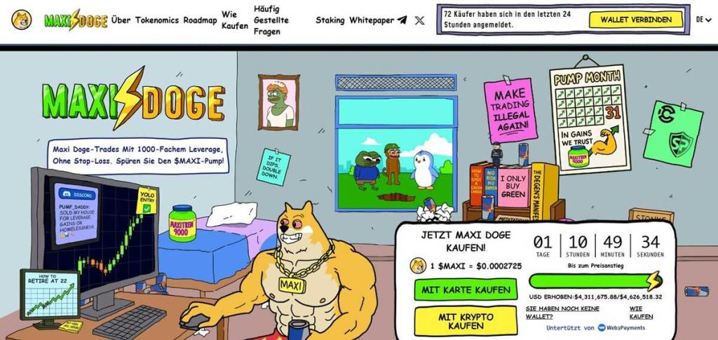 Der Token $MAXI befindet sich aktuell in der Presale-Phase und hat bereits über 4,2 Millionen US-Dollar eingesammelt. Die Preisstruktur steigt stufenweise, derzeit liegt der Token ungefähr im Bereich von 0,00027 US-Dollar. Zusätzlich lockt das Projekt frühe Unterstützer mit hohen Staking-Renditen, die im Marketing mit rund 72 bis 73 Prozent APY angegeben werden – ein Wert, der klar zeigt, dass hier risikofreudige Anleger angesprochen werden.