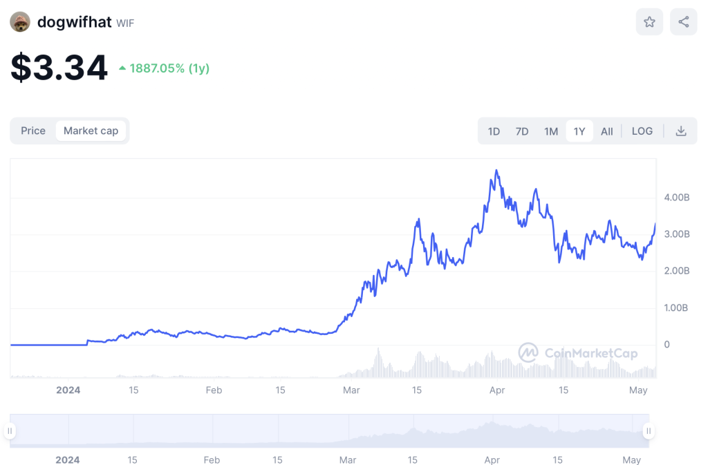 Aktuell notiert Dogwifhat nach Daten von CoinMarketCap bei 3,34 US-Dollar. Knapp unter 5 US-Dollar notierte WIF bereits im April 2024 und ist aktuell der viertwertvollste Meme-Coin, nach DOGE, SHIB und PEPE.