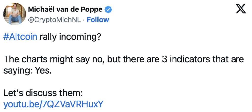 Der bekannte Krypto-Experte Michaël van de Poppe hat mitgeteilt, dass drei Indikatoren auf den Beginn einer neuen Altcoin-Saison verweisen. Aus diesem Grunde hat er sein Portfolio indessen vollständig in die alternativen Kryptowährungen umdisponiert, obwohl viele Investoren von der Performanz dieser zuletzt enttäuscht wurden. Dabei folgt der Krypto-Experte jedoch einer alten Börsenweisheit, dass man kaufen sollte, wenn das Blut in den Straßen fließt.