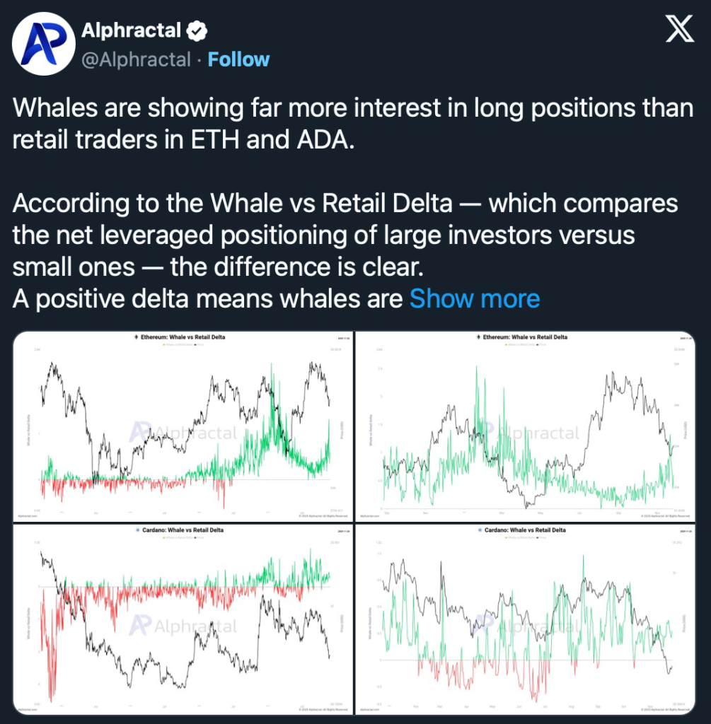 Interessant ist dabei besonders das Verhalten der großen Marktteilnehmer. Laut der Analyseplattform Alphractal investieren ETH-Wale deutlich stärker in Long-Positionen, während Kleinanleger eher in Unsicherheit verfallen. Das Wale-vs-Retail-Delta befindet sich inzwischen klar im positiven Bereich.