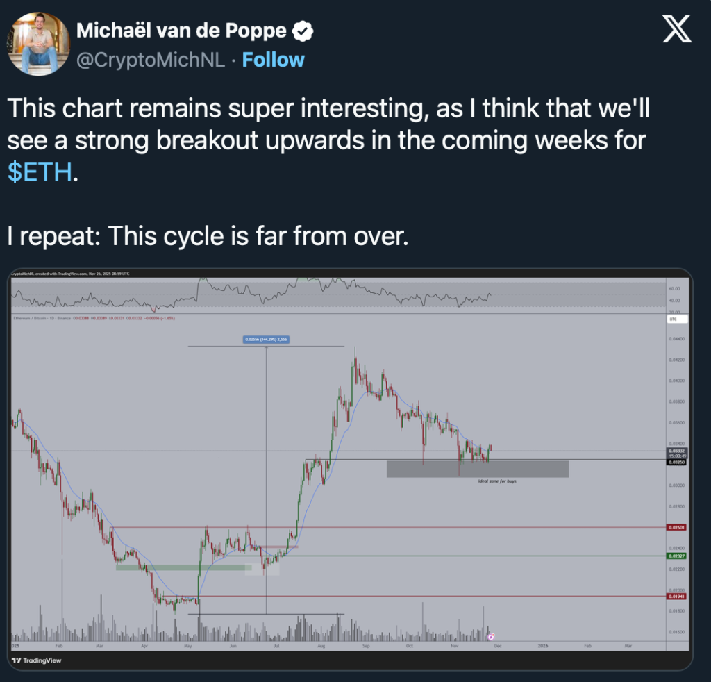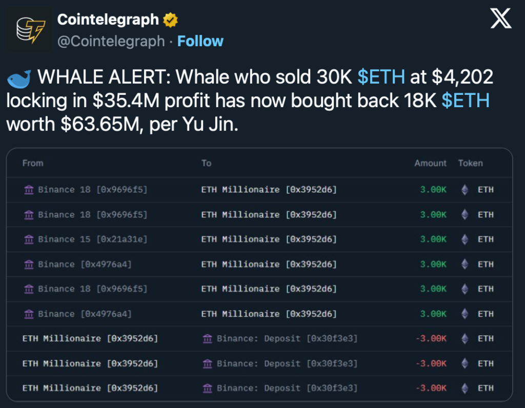 Ein Beispiel: Ein Investor, der bei einem ETH-Kurs von über 4200 $ rund 30.000 ETH verkauft hatte, kaufte laut Cointelegraph jüngst wieder 18.000 ETH im Wert von 63,65 Millionen $ nach. Auch Analyst Michael van de Poppe sieht das aktuelle Preisniveau um 3000 $ als attraktiven Einstiegspunkt.
