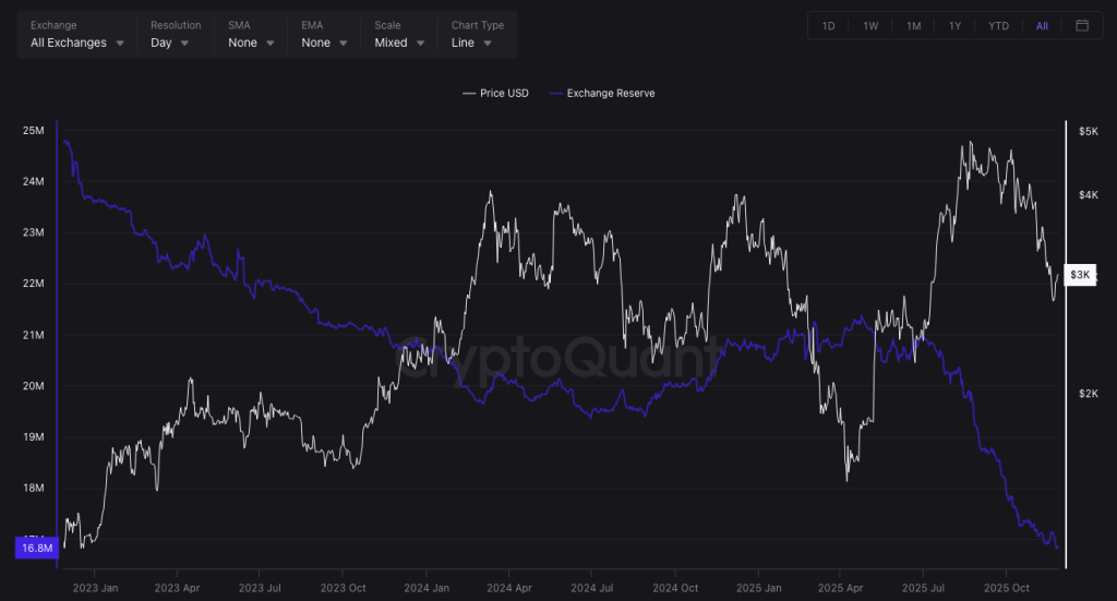 Trotz der jüngsten Marktturbulenzen, in denen ETH innerhalb eines Monats rund 30 % einbüßte und zeitweise sogar den wichtigen 3000-$-Support verlor, zeigt sich ein gegenteiliger Trend bei den Exchange-Beständen. Während viele Retail-Anleger in Panik verkauft haben, fließen gleichzeitig große Mengen ETH von den Börsen ab.