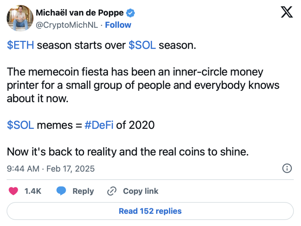 Die Dominanz von Solana im Bereich der Memecoins scheint nachzulassen, wie aktuelle Daten von CoinMarketCap belegen. Das Handelsvolumen ist in den vergangenen 30 Tagen um etwa 30 Prozent zurückgegangen. Van de Poppe sieht darin ein Zeichen dafür, dass der Memecoin-Hype auf Solana seinen Höhepunkt überschritten haben könnte.