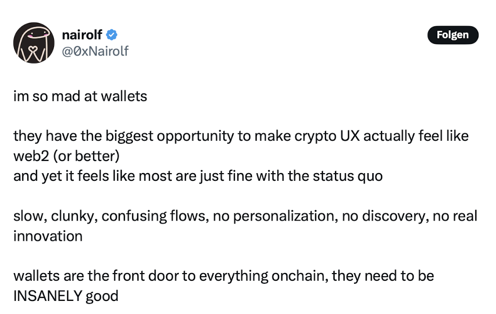 Nairolf zählt zu den am meisten beachteten Krypto-Experten und belegt in dieser Hinsicht gerade laut Kaito Yaps den 10 Platz, wobei er 0,44 % der gesamten Aufmerksamkeit von Crypto Twitter auf sich zieht. Jetzt hat er sich kritisch über die aktuelle Lage der Wallets geäußert, über welche er sehr verärgert ist. Denn mit ihnen wäre es möglich, die Erfahrung des Web3 an die des vorherigen Web2 anzugleichen oder sogar zu verbessern.