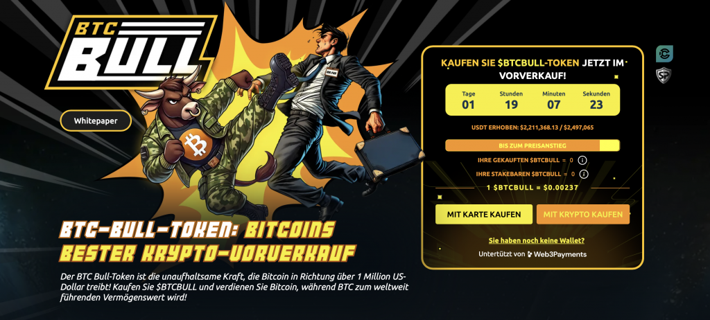 Der neue BTC Bull Token ($BTCBULL) hat bereits in der ersten Woche des Vorverkaufs über 2,2 Millionen Dollar eingesammelt. Das Projekt verbindet einen Meme Coin mit direkten Bitcoin-Rewards und implementiert verschiedene Mechanismen, die bei Erreichen bestimmter Bitcoin-Kursziele aktiviert werden.
