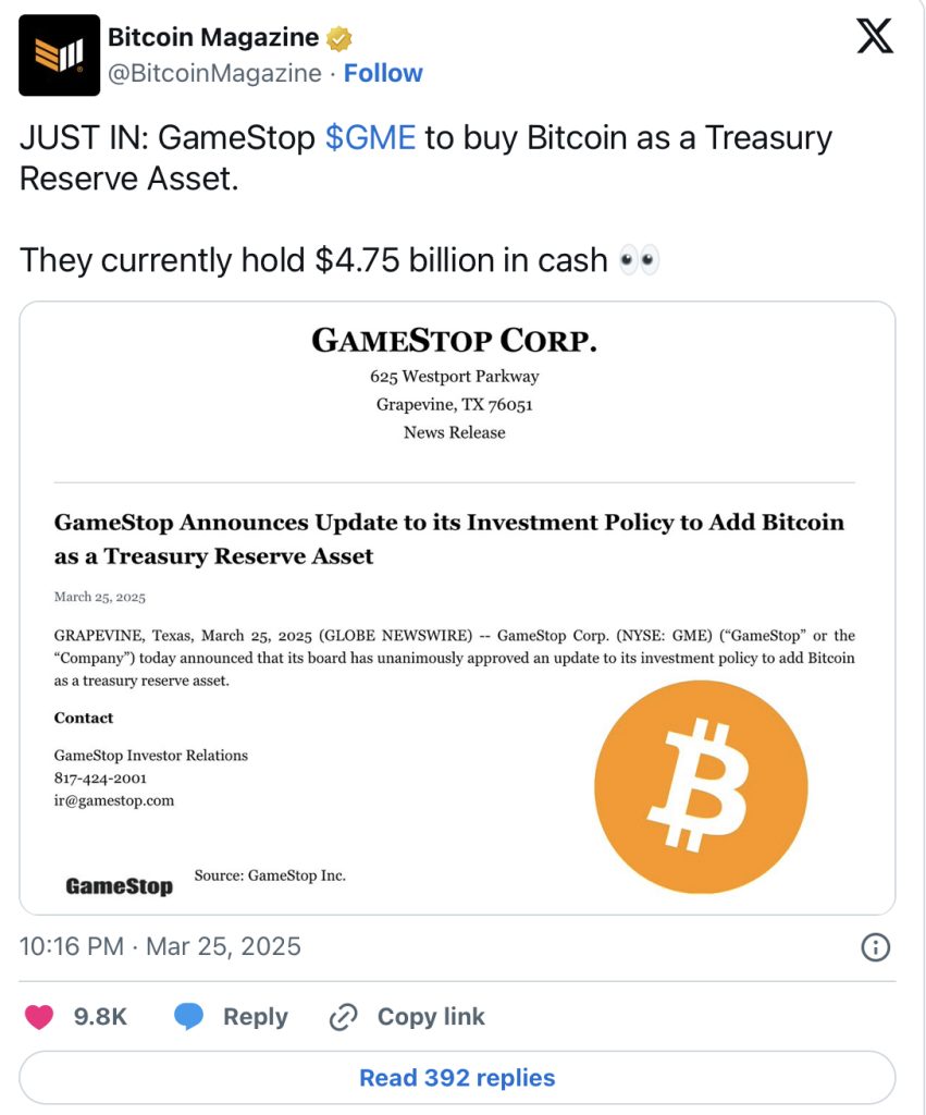 GameStop genießt seit 2021 besondere Aufmerksamkeit an den Finanzmärkten, als die Aktie durch koordinierte Aktionen von Kleinanlegern, ausgelöst durch einen Reddit-Post des Nutzers Keith Gill (bekannt als “Roaring Kitty”), eine beispiellose Rallye erlebte. Damals stieg der Aktienkurs um das 24-fache, was vielen Kleinanlegern erhebliche Gewinne bescherte. Eine ähnliche Entwicklung wird diesmal jedoch nicht erwartet. Vielmehr wird die Entscheidung von GameStop als positives Signal für Bitcoin selbst und als Zeichen für die wachsende institutionelle Akzeptanz der Kryptowährung gewertet.