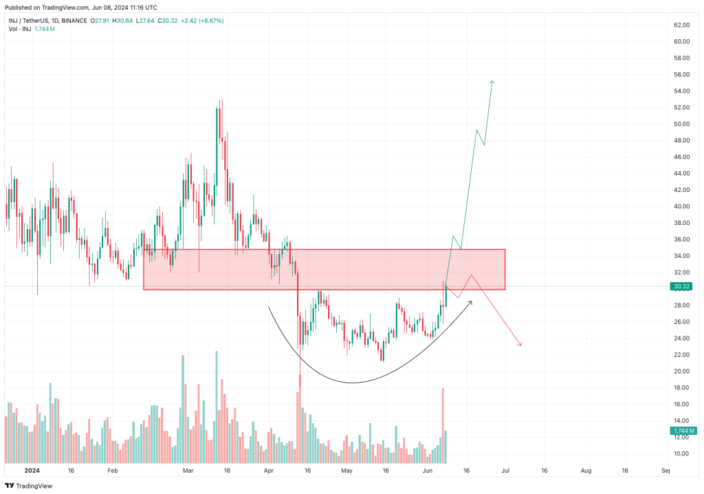 Seit dem Erreichen dieses Tiefstwerts Mitte Mai konnte INJ jedoch wieder an Wert gewinnen. In den letzten 24 Stunden gelang es ihm, erneut über 30 USD zu steigen. Die Entwicklung deutet auf eine eindeutige Bodenbildung hin, von der aus der Coin nun in immer schnellerem Tempo zu steigen beginnt. Solche Entwicklungen sind oft ein Zeichen für den Beginn einer bullischen Marktphase und führen viele INJ-Anleger zu der Frage, wie es für den Coin weitergehen könnte und ob möglicherweise eine massive Rallye von über 100 % bevorsteht.