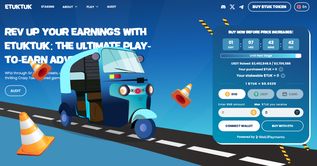 Das Play-to-Earn Projekt eTukTuk ist noch so neu, dass der Coin TUK sogar noch vor seiner ersten Markteinführung steht und aktuell im Pre-Sale für nur 0,0325 USD erworben werden kann. Der Pre-Sale hat bereits über 3,4 Millionen USD an Investitionen eingebracht, was das große Interesse vieler Anleger an diesem vielversprechenden Play-to-Earn-Krypto-Projekt verdeutlicht.