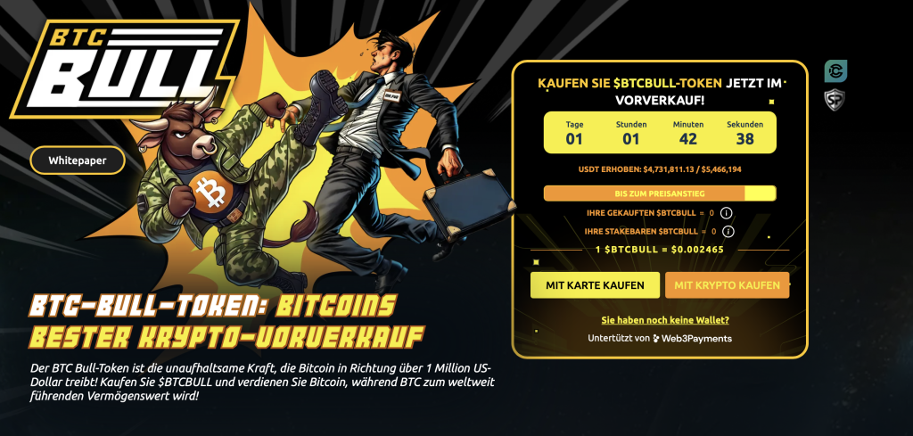 Das Konzept sorgt für Aufsehen, da $BTCBULL der erste Meme Coin ist, bei dem Anleger echte Bitcoin verdienen und so von der Kursentwicklung beider Coins profitieren können. Außerdem ist eine Staking-Funktion integriert, die in den ersten 2 Jahren überdurchschnittlich hohe Renditen auszahlt. Aktuell ist $BTCBULL noch im Vorverkauf erhältlich, wobei fast 5 Millionen Dollar investiert wurden. Dadurch wird schnell deutlich, dass $BTCBULL das Potenzial hat, nach dem Launch um das 5- bis 10-fache zu steigen.