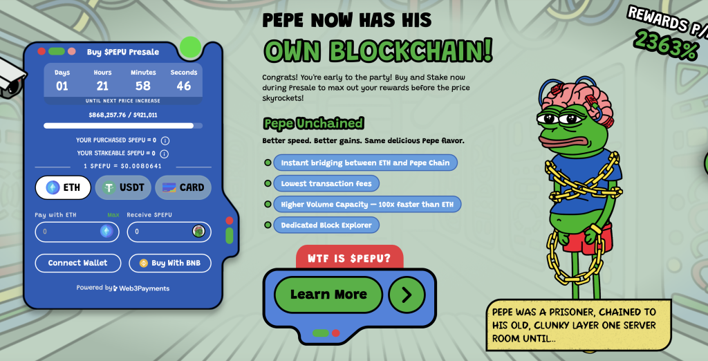 Pepe Unchained (PEPU) ist nicht nur ein weiterer Meme Coin. Das Projekt kommt mit einer eigenen Layer 2 Chain, die günstige Token Transfers ermöglichen soll und auch eine Staking-Funktion ist integriert, wodurch sich Pepe Unchained von den meisten Meme Coins abhebt. Die jährliche Rendite für Staker variiert mit der Größe des Staking Pools und ist daher vor allem am Anfang besonders hoch. Derzeit ist PEPU noch im Initial Coin Offering (ICO) erhältlich und hat bereits in den ersten Tagen über 800.000 Dollar umgesetzt. Die hohe Nachfrage in so kurzer Zeit führt Analysten zu der Annahme, dass der Coin noch stark unterbewertet sein könnte.