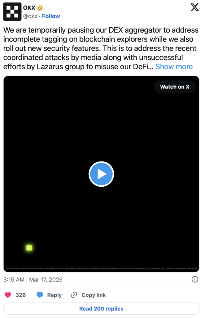 OKX erklärte bereits in einer offiziellen Mitteilung, dass man in enger Absprache mit Regulierungsbehörden handle und bereits zahlreiche Sicherheitsverbesserungen vorgenommen habe. Dazu gehört unter anderem ein Echtzeit-Tracking-System zur Erkennung und Blockierung bösartiger Adressen sowie ein Hacker-Adressen-Erkennungssystem für den Web3-DEX-Aggregator. Obwohl der DEX-Aggregator derzeit nicht verfügbar ist, bleiben die Wallet-Services weiterhin voll funktionsfähig, mit der einzigen Einschränkung, dass neue Wallets in bestimmten Märkten vorübergehend nicht erstellt werden können.