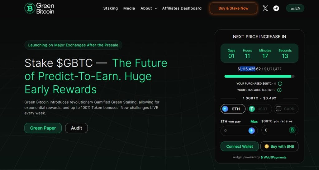 Im Gegensatz zum etablierten Bitcoin bietet Green Bitcoin einen innovativen Ansatz. Es fungiert als eine gamifizierte Vorhersageplattform, die Nutzer belohnt, deren Bitcoin-Preisprognosen zutreffen. Diese Funktion, kombiniert mit seinem jüngsten Fundraising-Erfolg, positioniert Green Bitcoin als vielversprechenden Klein-Cap-Token. Analysten deuten darauf hin, dass es das Potenzial hat, im Wert um bis zu 100 Mal zu steigen.