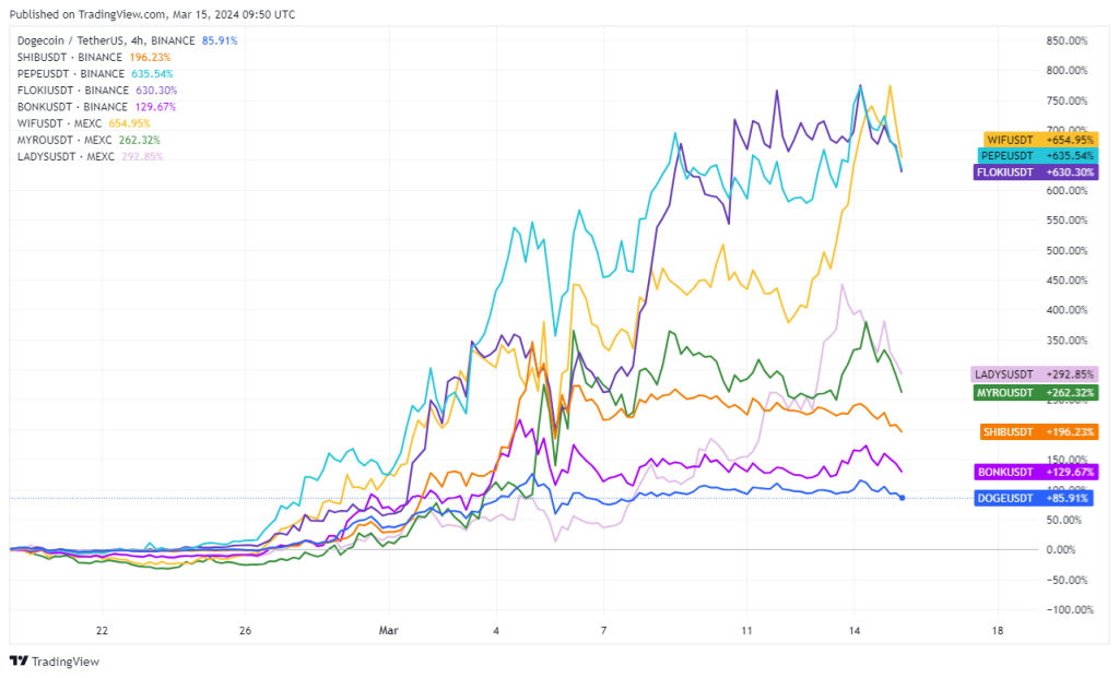 Diese Annahme bestätigen die aktuellen Daten. Wie der untenstehende Chart zeigt, übertreffen neuere, kleinere Meme-Coins wie $PEPE, $WIF und $FLOKI bereits die etablierten Größen. Diese Entwicklungen bieten eine einzigartige Chance für Investoren, die früh in potenziell erfolgreiche Projekte einsteigen möchten.