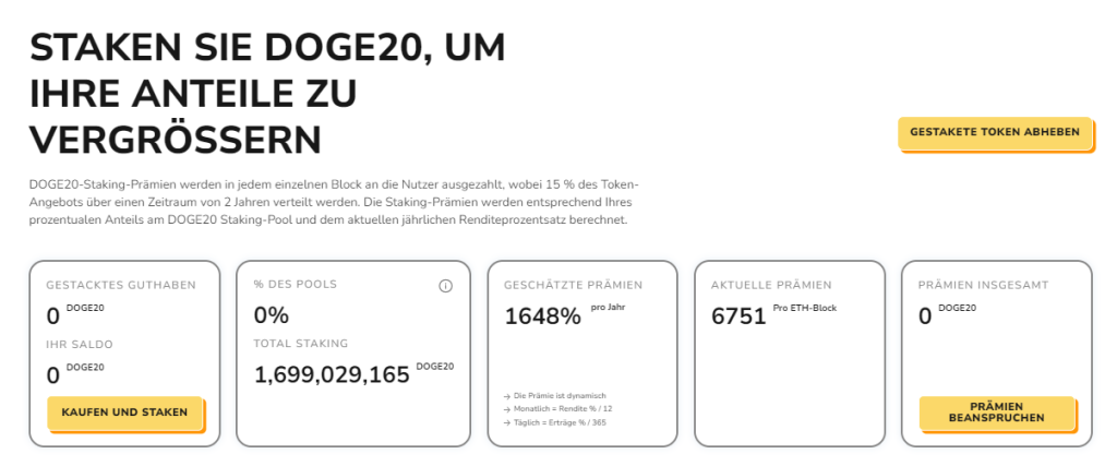 15 % der gesamten Tokenmenge, die 140 Milliarden beträgt, sind für die Belohnung der Staker reserviert. Diese Belohnungen verteilen sich über zwei Jahre: Im ersten Jahr sind 12,5 % des Angebots erhältlich, im zweiten Jahr zusätzliche 2,5 %. Je größer der Anteil eines Stakers am Staking-Pool ist, desto höher fällt die Belohnung aus – für jeden Ethereum-Block werden 6.751 Dogecoin20 als Belohnungen ausgeschüttet.