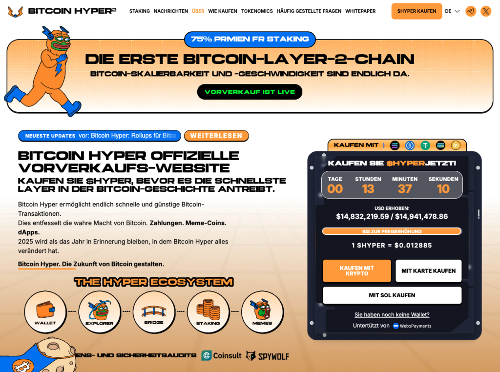 HYPER wird im Vorverkauf gerade noch zum Kurs von 0,012885 $ angeboten, und auf diesem Weg kamen schon über 14,8 Millionen $ an Funding von interessierten Investoren zusammen. Der Kauf ist ganz einfach mit Bankkarte oder etablierten Kryptowährungen über die offizielle Website und das dort befindliche Presale-Widget möglich. Im Vorverkauf erworbene Coins können im Anschluss zudem direkt für eine jährliche Rendite von bis zu 75 % gestakt werden.