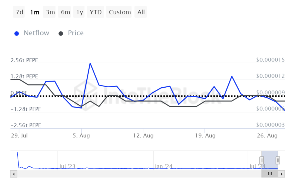 Pepe-Wale scheinen nun bereit, auf Pepe Unchained umzusteigen. Zumindest zeigt sich eine schwächelnde Nachfrage nach $PEPE, dem drittgrößten Meme-Coin. Am Mittwoch wurden laut IntoTheBlock etwa 1,16 Billionen $PEPE im Wert von 8,96 Millionen US-Dollar von großen Wallets abgezogen, was auf sinkendes Vertrauen hinweist.