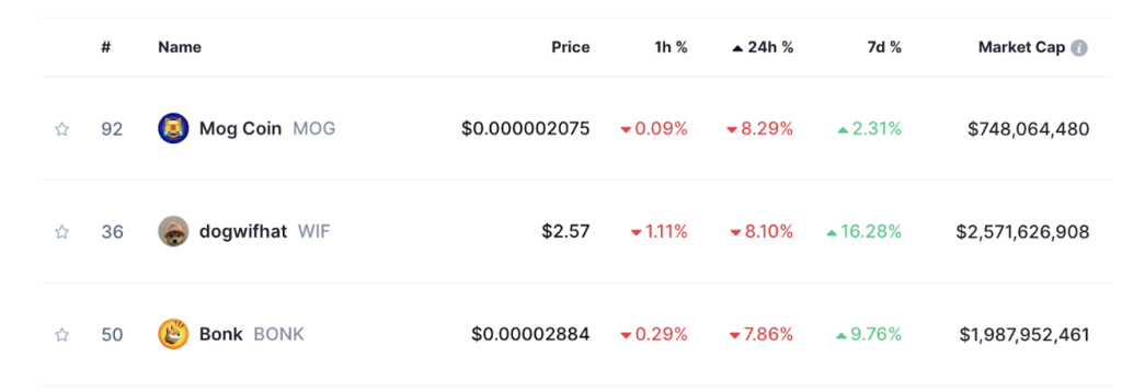 Schaut man sich die Top 100 Coins nach Marktkapitalisierung absteigend nach 24 Stunden Verlusten an, sind MOG, WIF und BONK die größten Verlierer. Verluste von rund 8 % muss man bei jedem der 3 Token hinnehmen. Allerdings zeigt sich vor allem bei WIF, dass die täglichen Schwankungen zwar massiv sein können, unterm Strich aber ein Plus übrig bleibt.