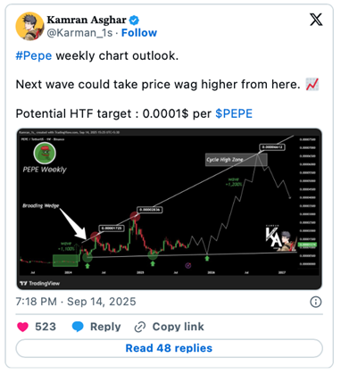 Der bekannte Krypto-Trader Kamran Asghar hat in dem Pepe-Chart ein Keilmuster identifiziert, welches auf einen zyklischen Preisanstieg hindeutet, der bis in das Jahr 2026 oder sogar 2027 anhalten könnte.