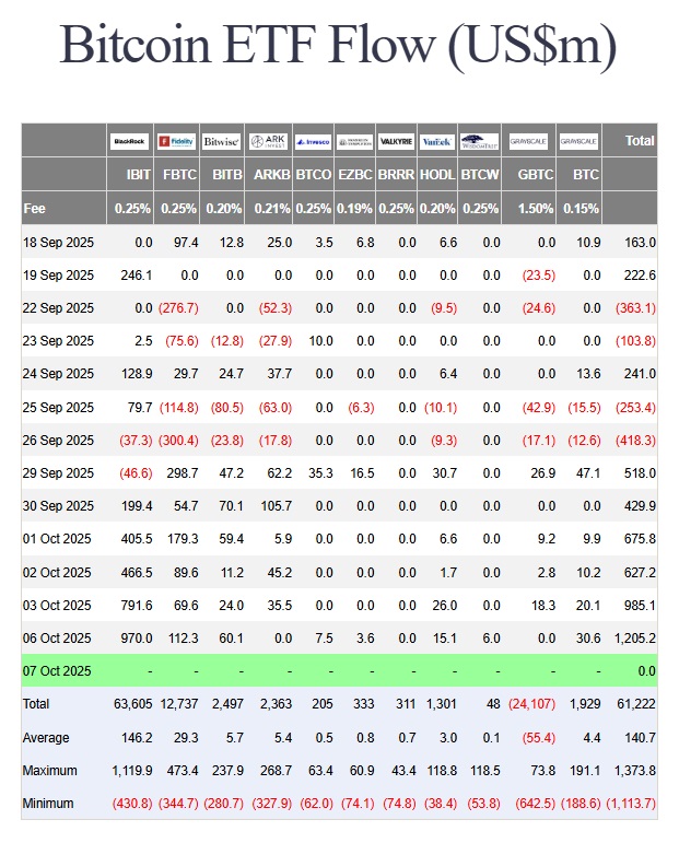 Am 6. Oktober flossen allein an einem Tag 1,2 Milliarden US-Dollar in Bitcoin ETFs. Damit erreichten die Zuflüsse das höchste Niveau seit November 2024. IBIT war dabei der klare Spitzenreiter und sicherte sich 1,8 Milliarden US-Dollar der wöchentlichen Gesamtsumme von 3,2 Milliarden US-Dollar. Diese Zahlen belegen, wie stark das Anlegerinteresse in den vergangenen Wochen gestiegen ist.