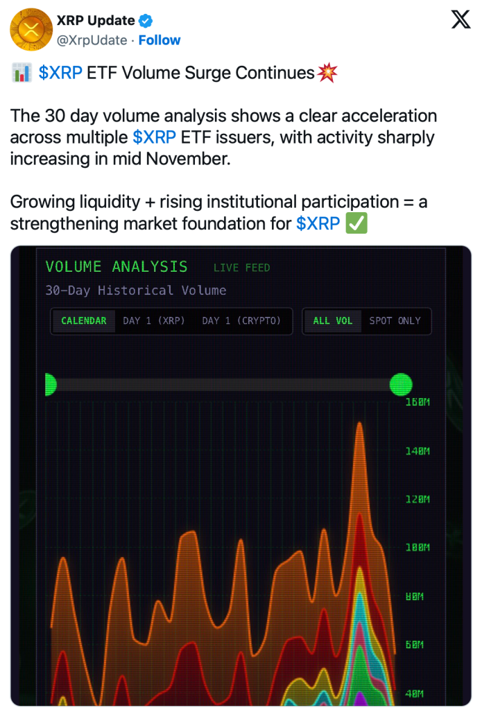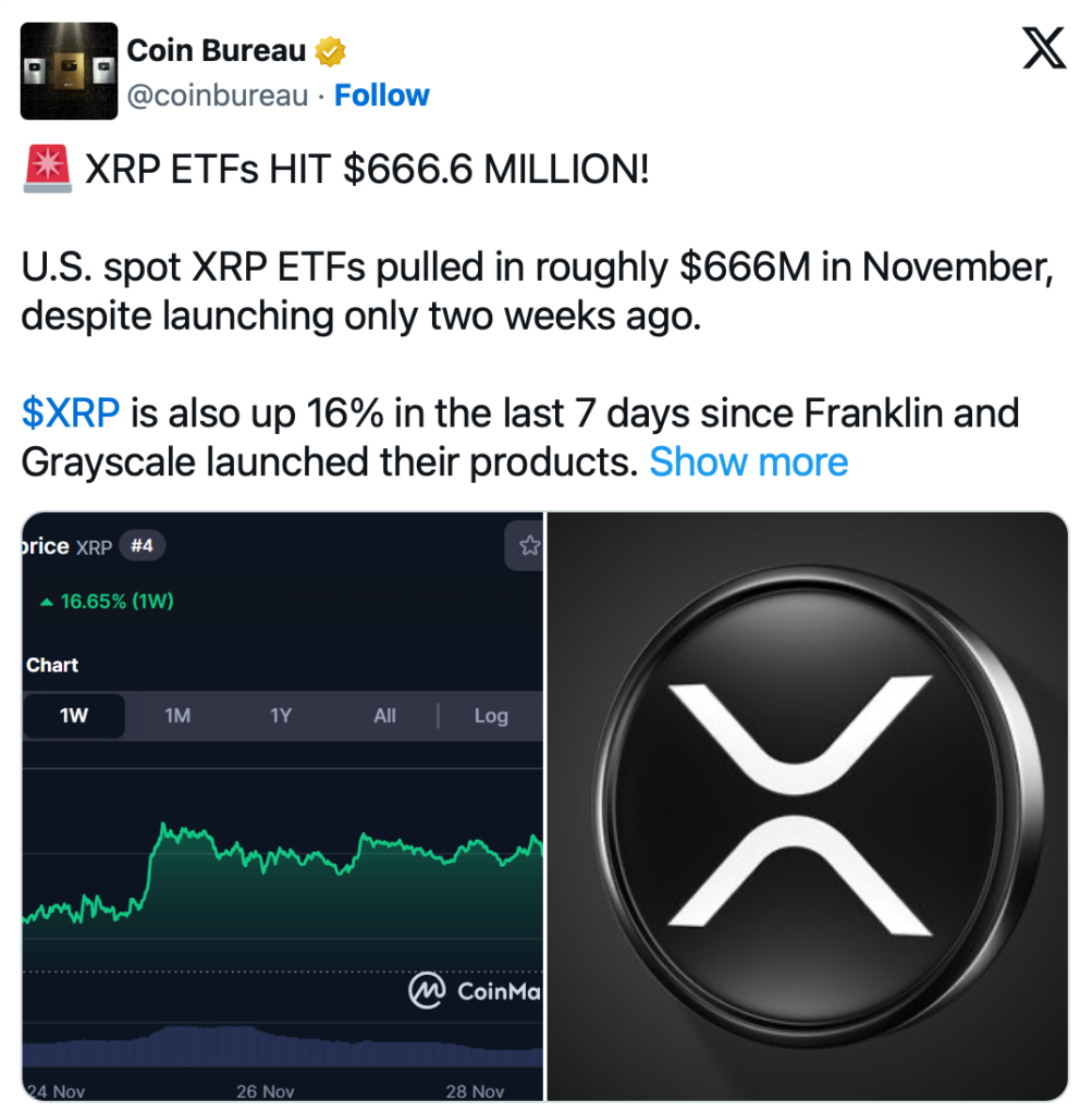 Die neuen XRP-ETFs zeigen bereits kurze Zeit nach ihrem Start ein starkes institutionelles Interesse. Allein im November flossen 666,6 Millionen US-Dollar in die Produkte – ein deutliches Zeichen, dass Investoren XRP trotz eines schwierigen Marktumfelds als vielversprechend einschätzen.