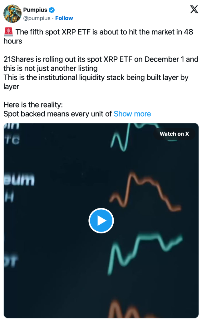 Auch der Start eines fünften Spot-XRP-ETFs steht kurz bevor. Da jeder ETF vollständig mit realem XRP besichert sein muss, entsteht zusätzlicher Nachfrage- und Verknappungsdruck – ein Mechanismus, der langfristig stark preistreibend wirkt.