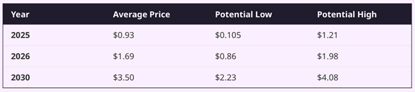 Sollte hingegen sogar der Bull Case eintreffen und ein Kurs von 1,21 USD ausgebildet werden, läge der Gewinn schon bei 1.027,7 % und die Rendite bei 11,3x. Dies sind allerdings nur die Prognosen für das laufende Jahr, wobei sie 2026 mit einem Höchstwert von 1,98 USD sogar noch bullischer ausfallen. Dies entspricht einem Plus von 1.745 % und 18,45x.