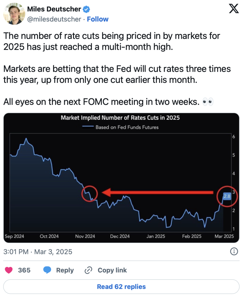 Laut Analyst Miles Deutscher preisen die Märkte mittlerweile drei Zinssenkungen für 2025 ein – deutlich mehr als noch zu Monatsbeginn. Der Fokus richtet sich nun auf das nächste FOMC-Meeting in zwei Wochen. Sollte die Fed eine taubenhafte Haltung bestätigen, könnte dies die Rallye bei Kryptowährungen und insbesondere bei Solana antreiben. Allerdings birgt diese Entwicklung auch Risiken: Wenn der Markt zunehmend Zinssenkungen einpreist, die dann ausbleiben, könnte ein scharfer Rücksetzer folgen.