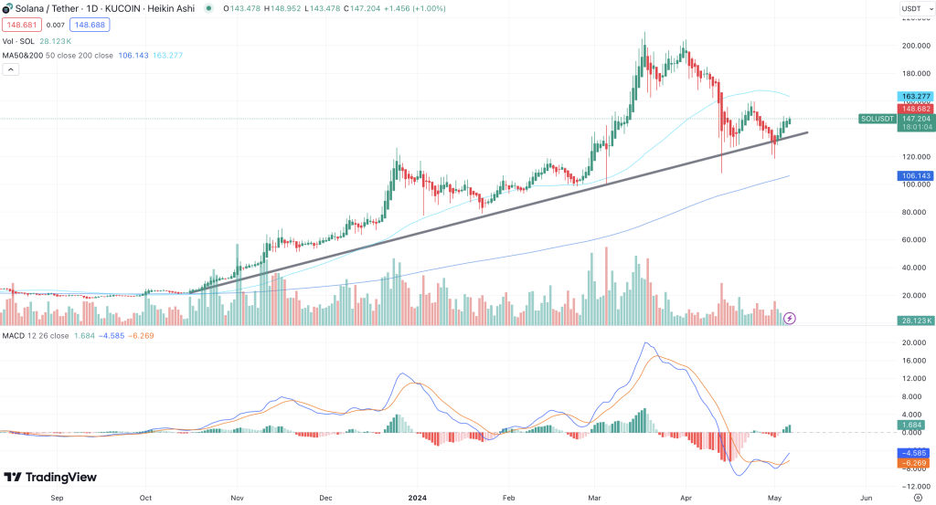 Solana hat sich nun die aufwärtsgerichtete Trendlinie zurückerobert. Auch der MACD-Indikator macht einen guten Eindruck und statuiert eine erfolgreiche Trendwende. Das Histogramm tickt im Tageschart wieder bullisch höher, die MACD-Linien haben sich bullisch überkreuzt.